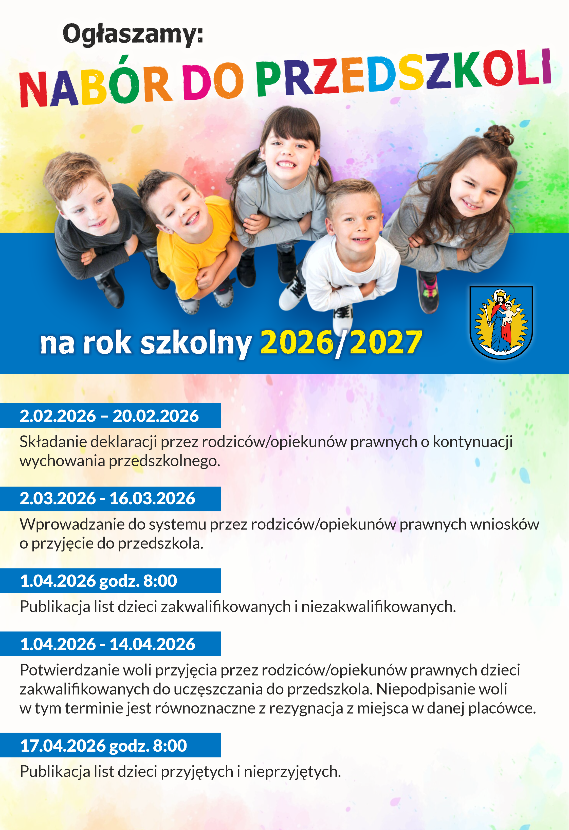 5. Dnia 17 kwietnia 2026 r. o godz. 8.00 w poszczególnych placówkach uczestniczących w rekrutacji zostaną wywieszone listy dzieci przyjętych i nieprzyjętych do przedszkoli publicznych, punktów przedszkolnych i oddziałów przedszkolnych w szkołach podstawowych.